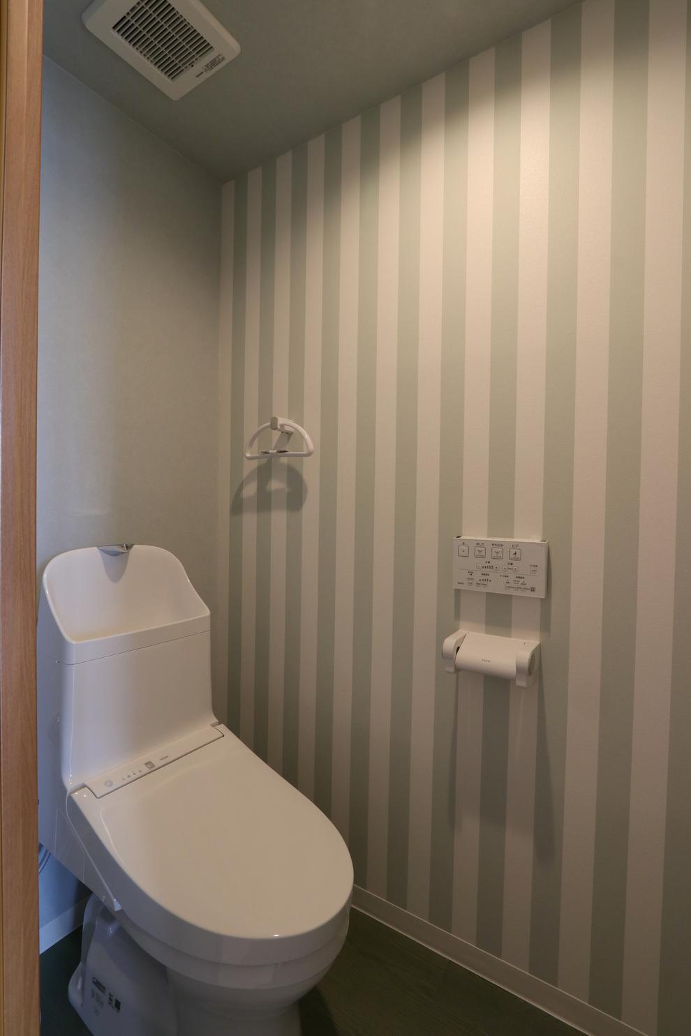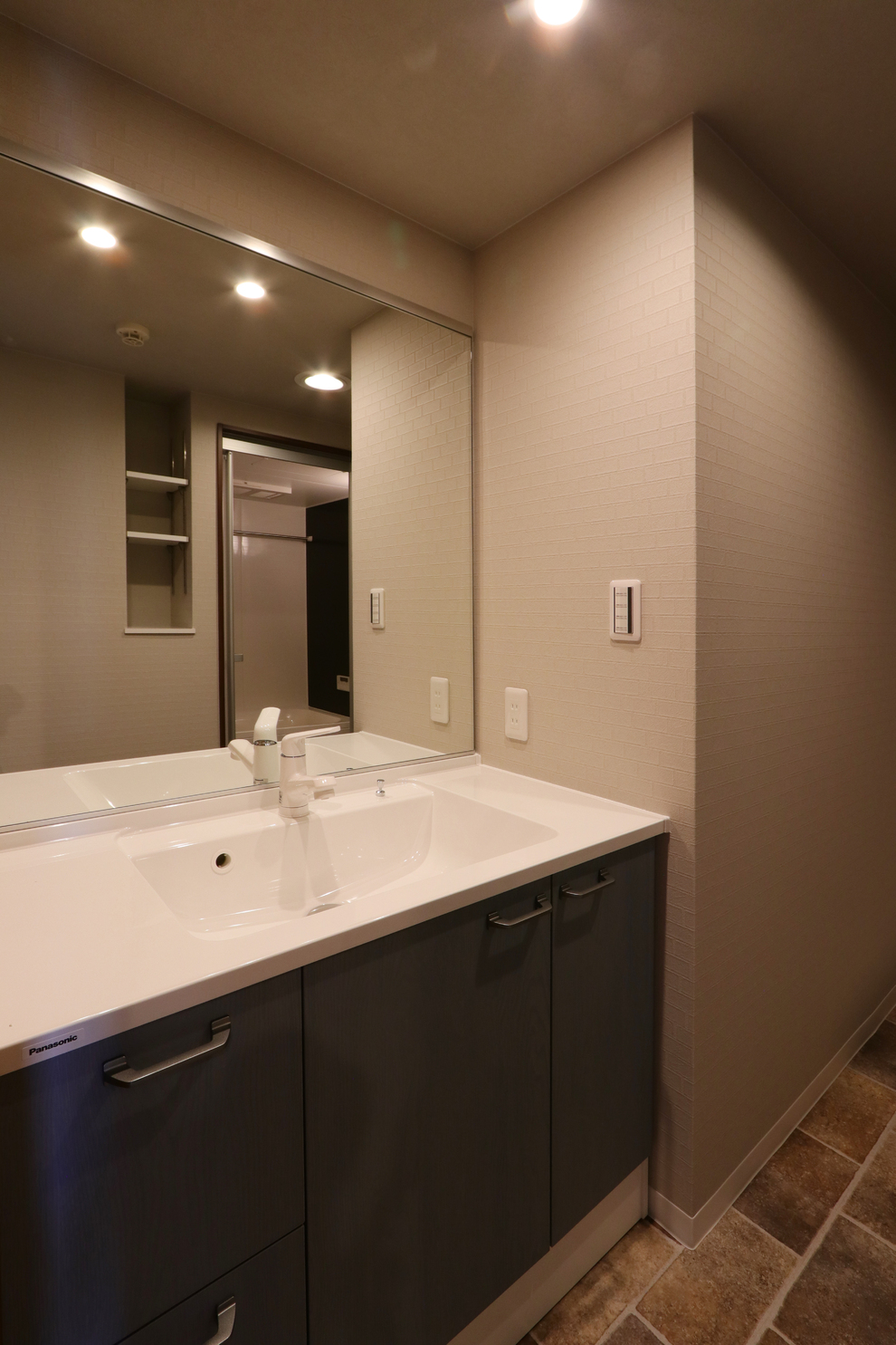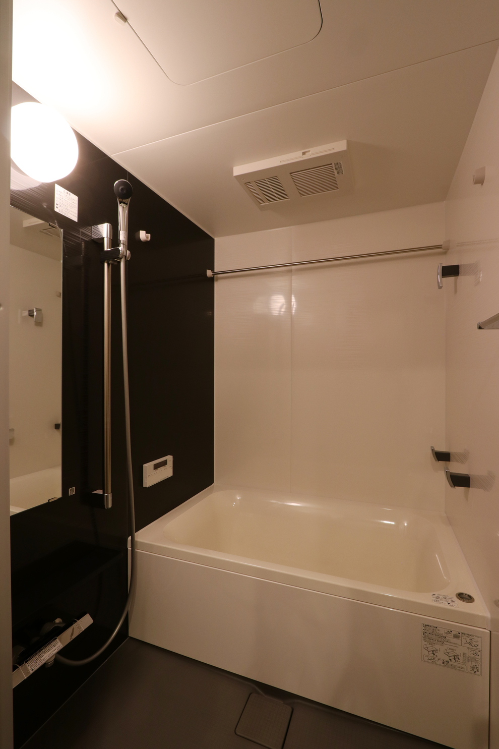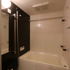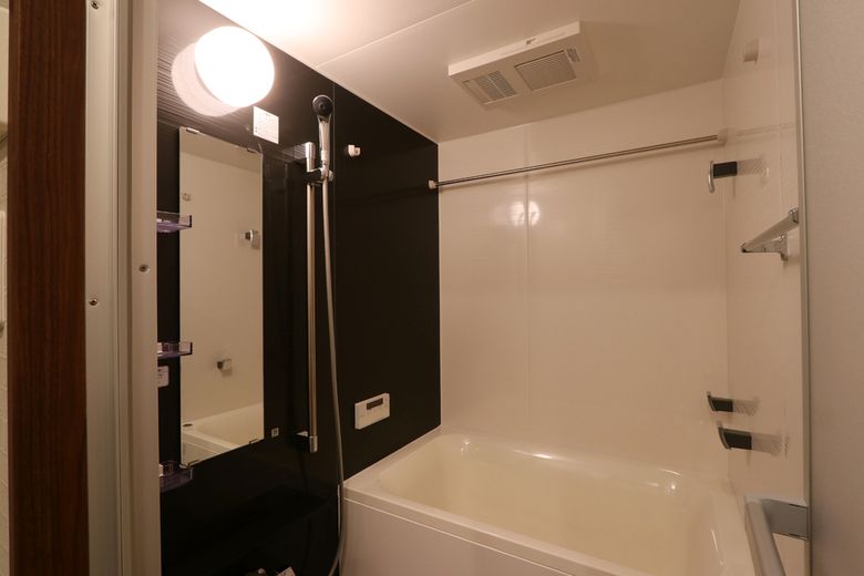 新調したバスルームは濃い色のパネルを使った落ち着いた空間です。
