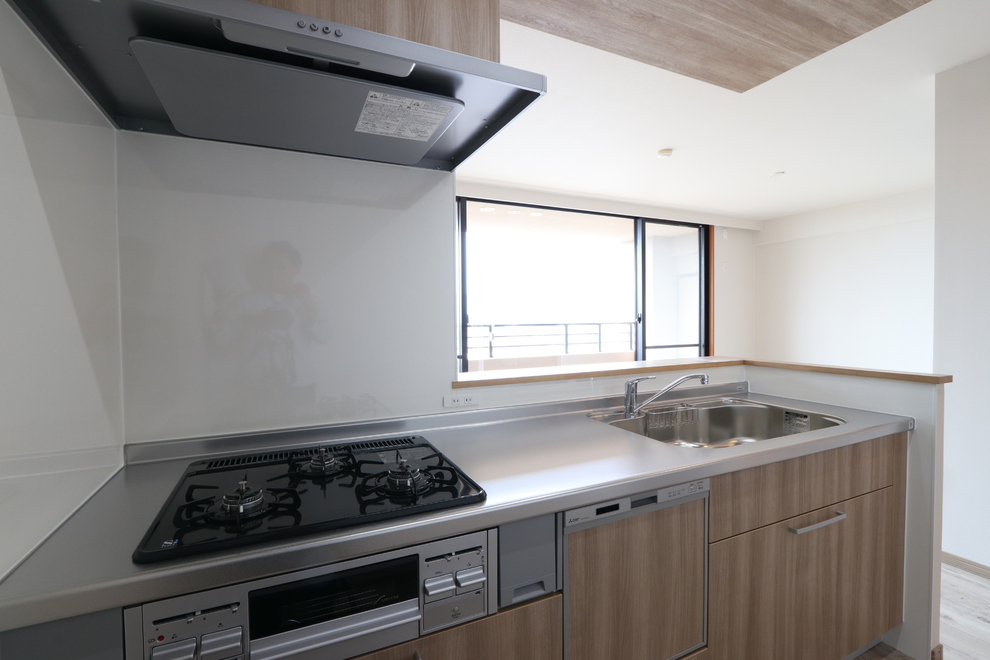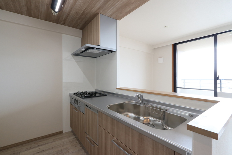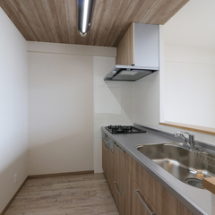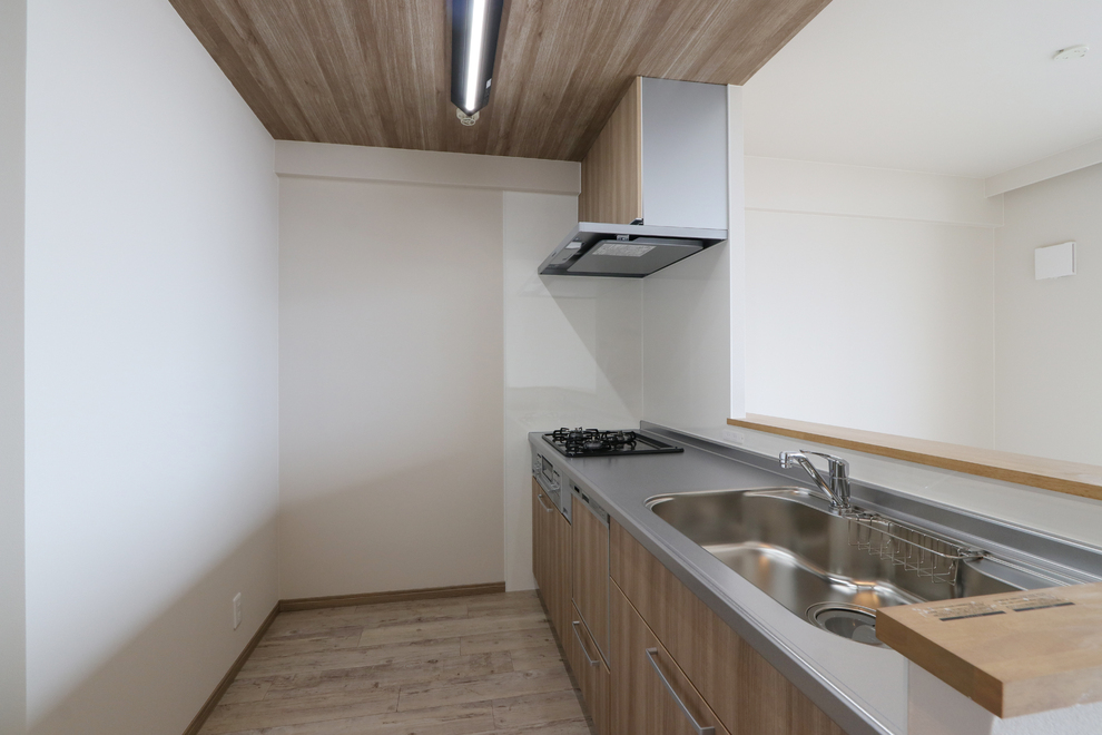 折り下げ天井に木調クロスをあしらったモダンなキッチンスペース。