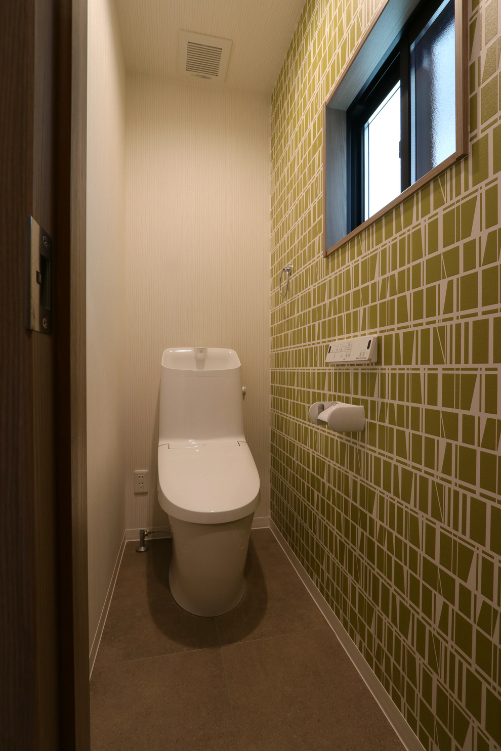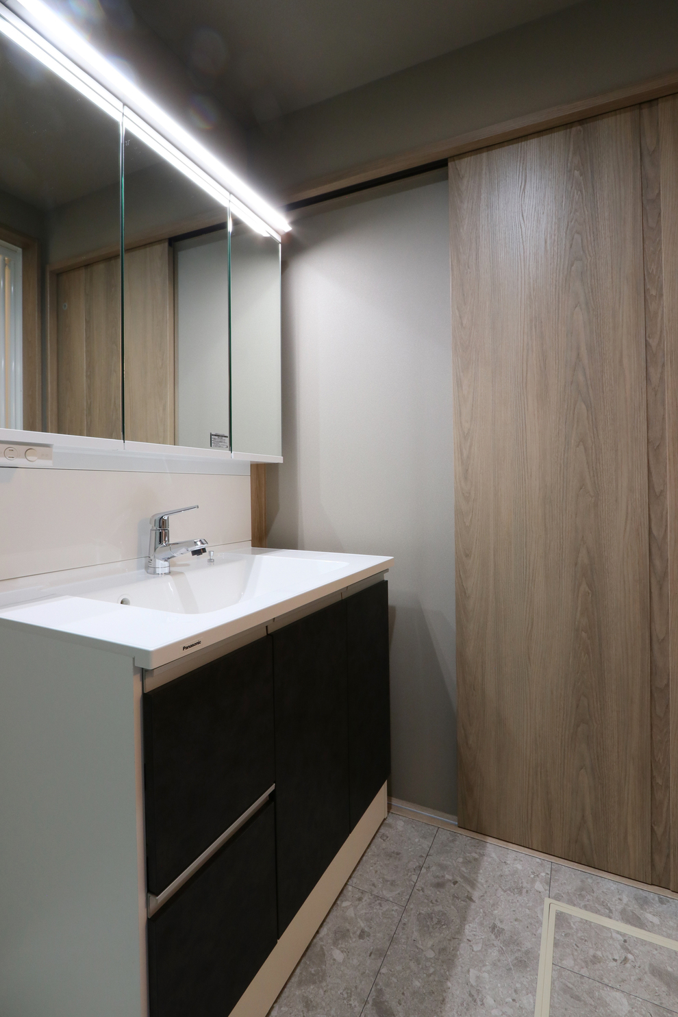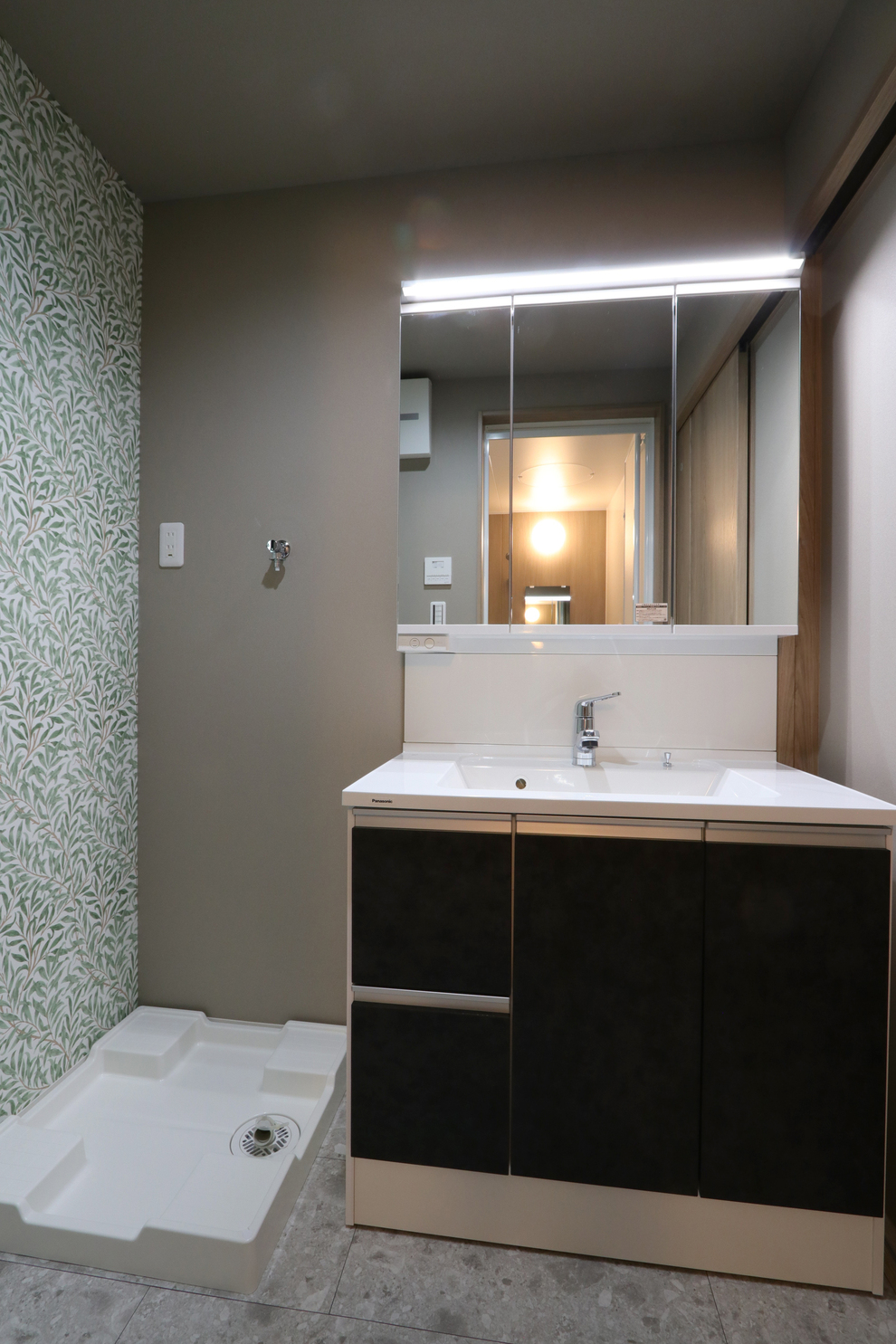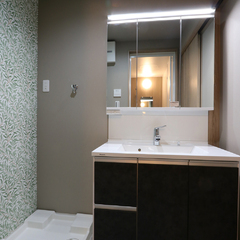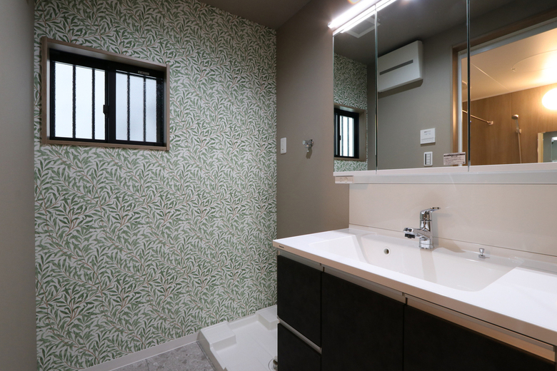 洗面室にもボタニカル柄のクロスでモダンさを演出。