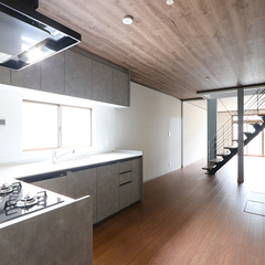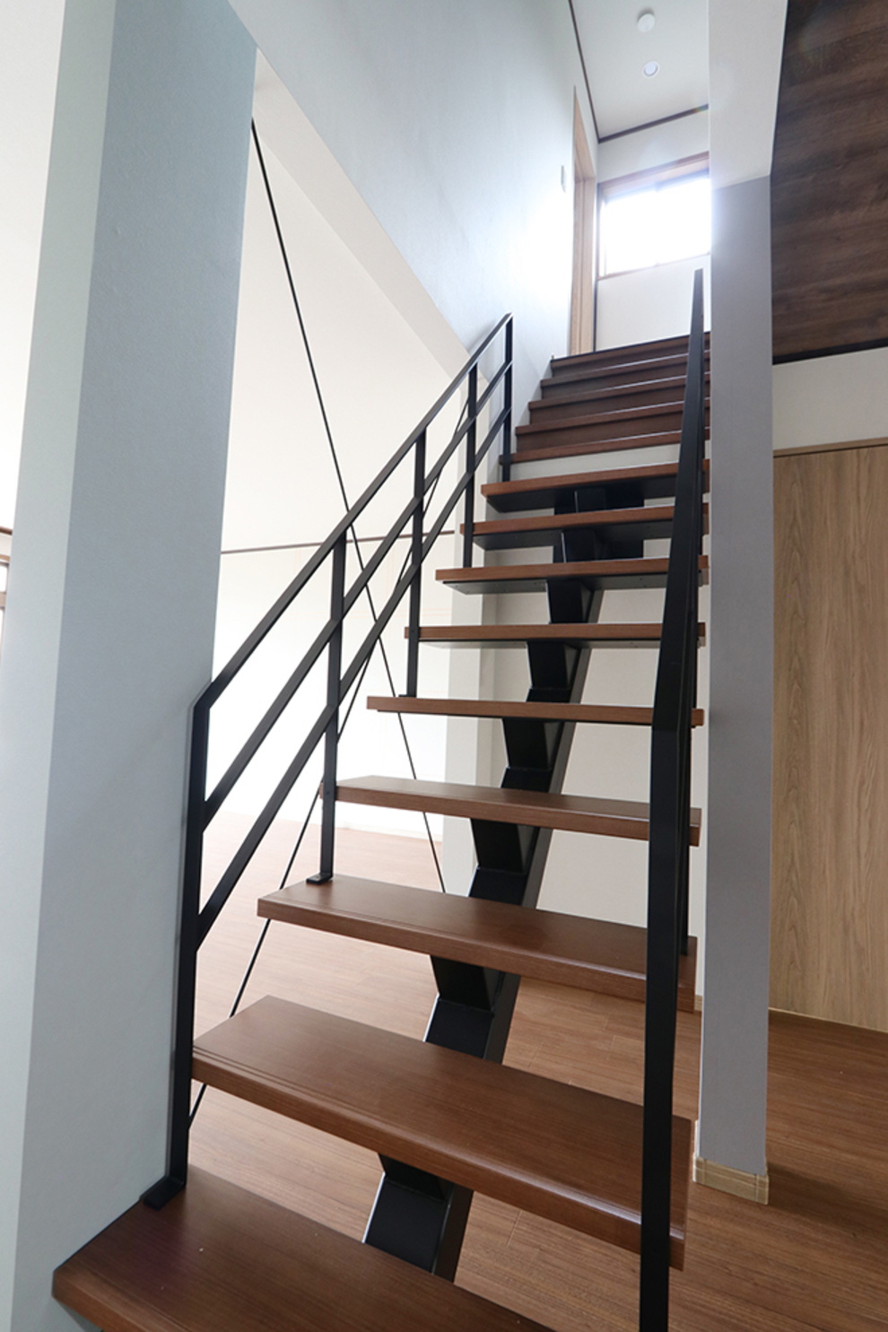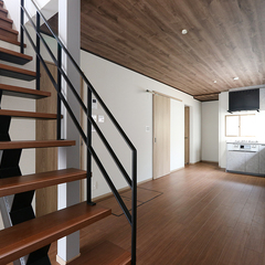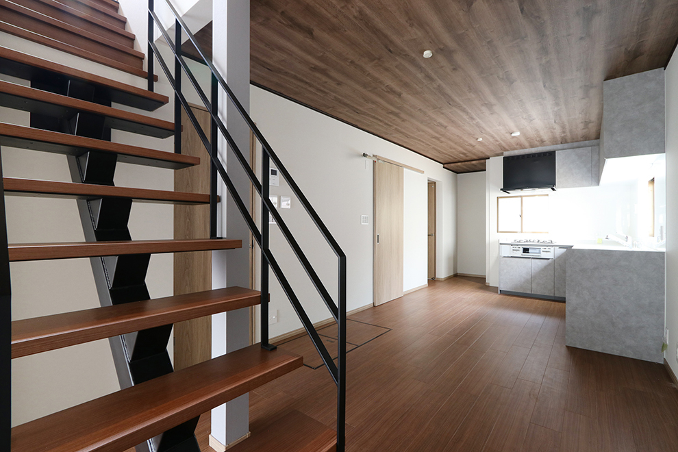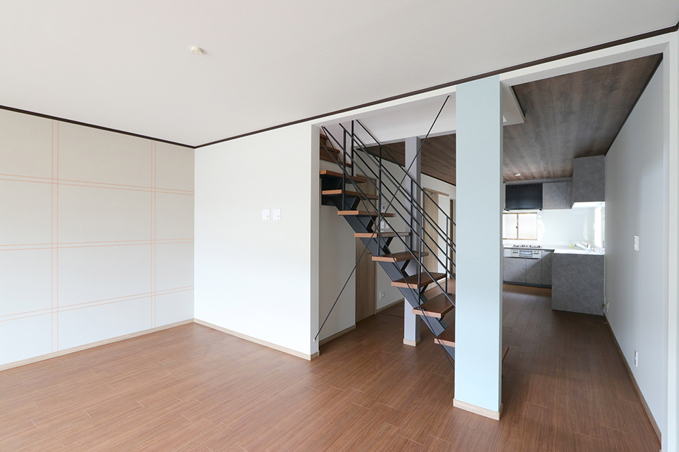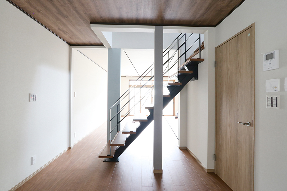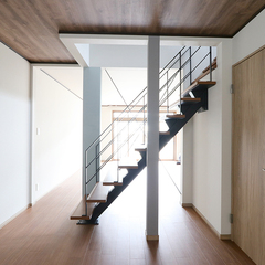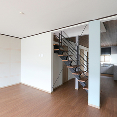 リビングにはモダンで印象的なスケルトン階段を配置。