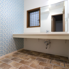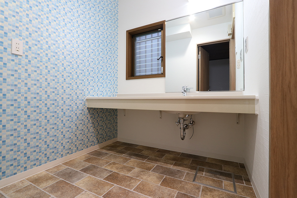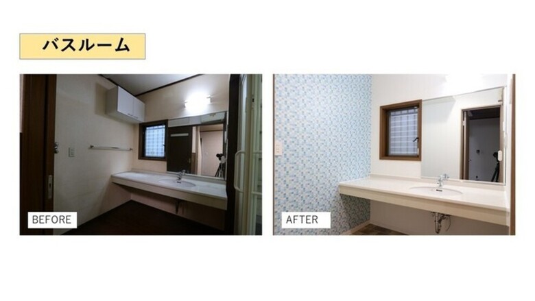 ワイドな洗面をそのまま使用。クロス貼替で明るい印象の洗面室にリニューアル。