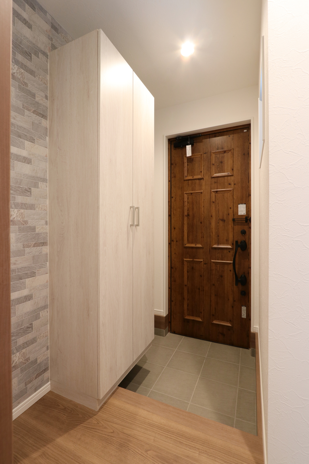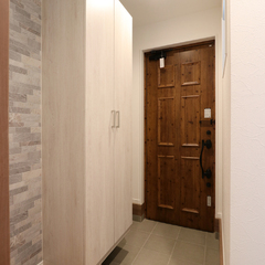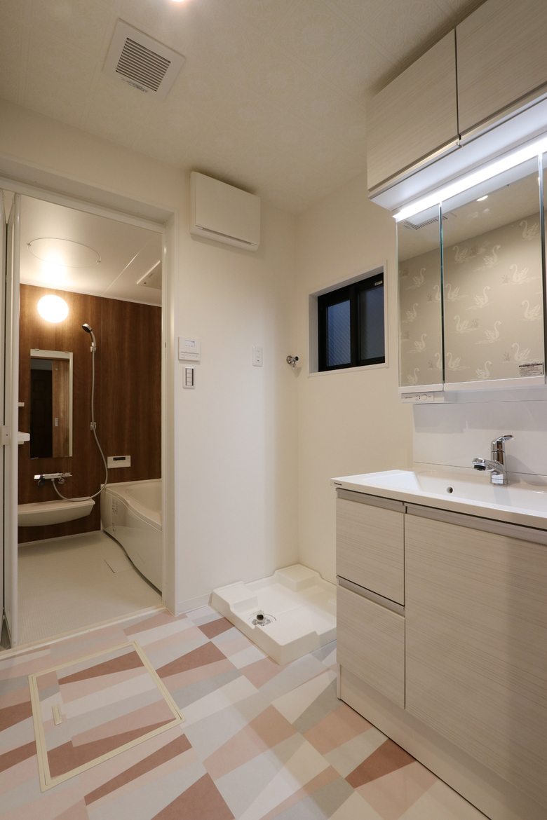 洗面室、バスルームは茶系と白のパネルでコーディネートした心落ち着く空間。