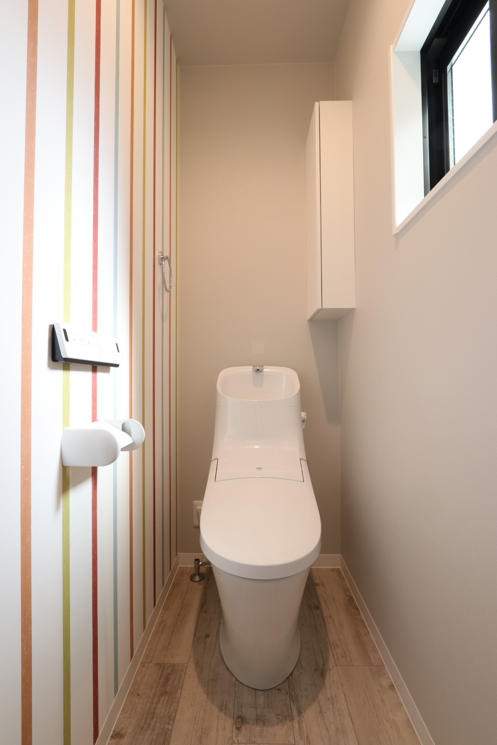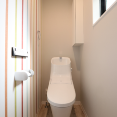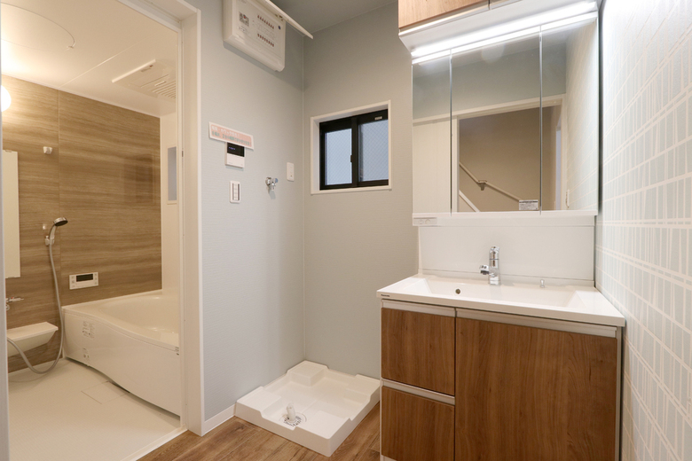 クロスとコーディネートしたカラーリングの洗面ドレッサー。